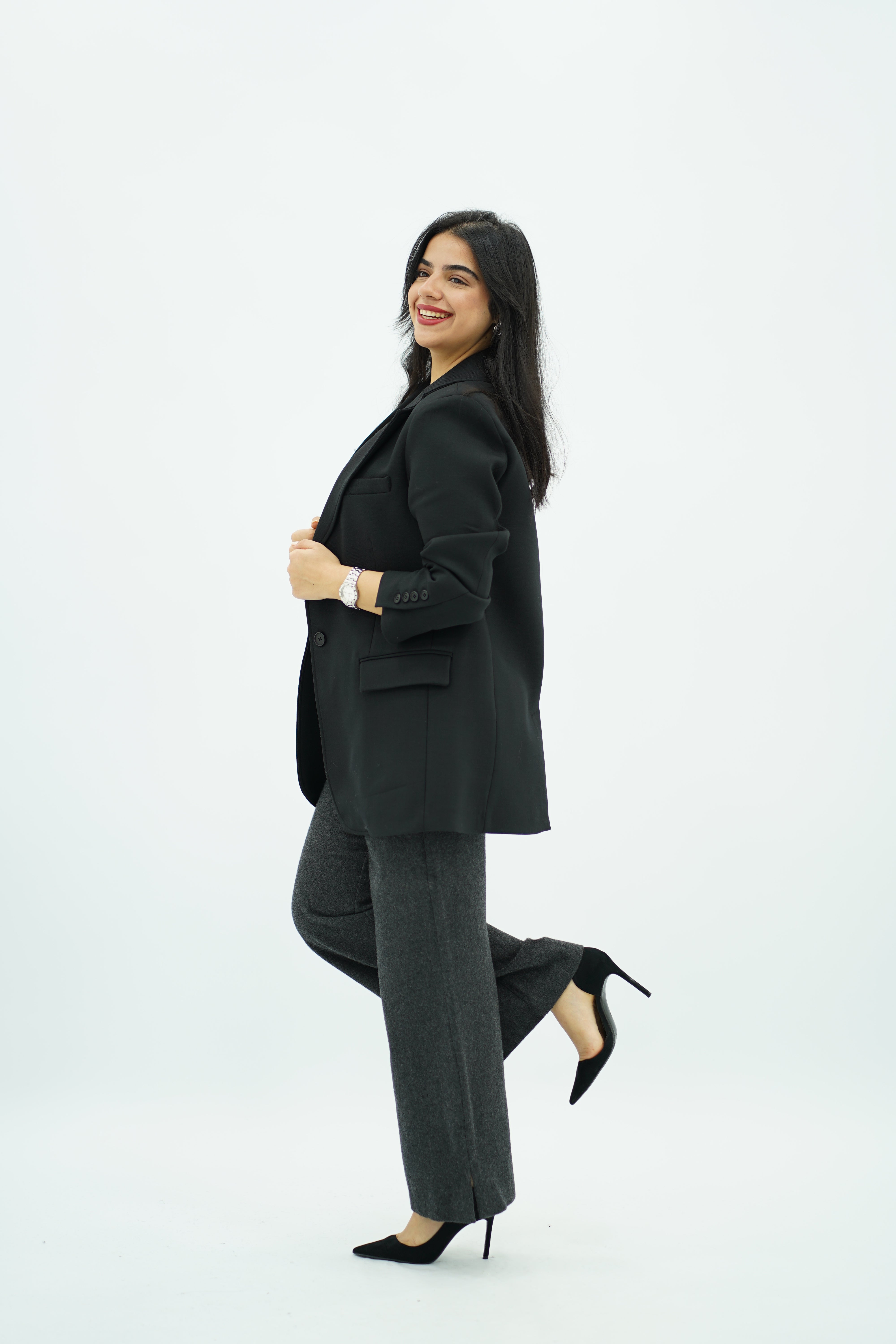 Ce blazer noir arbore une coupe oversize moderne et structurée, parfaite pour un look professionnel ou décontracté. Il présente un col à revers classique, une fermeture à un seul bouton (ouvert ici) et des épaules légèrement rembourrées, offrant un style polyvalent et intemporel.