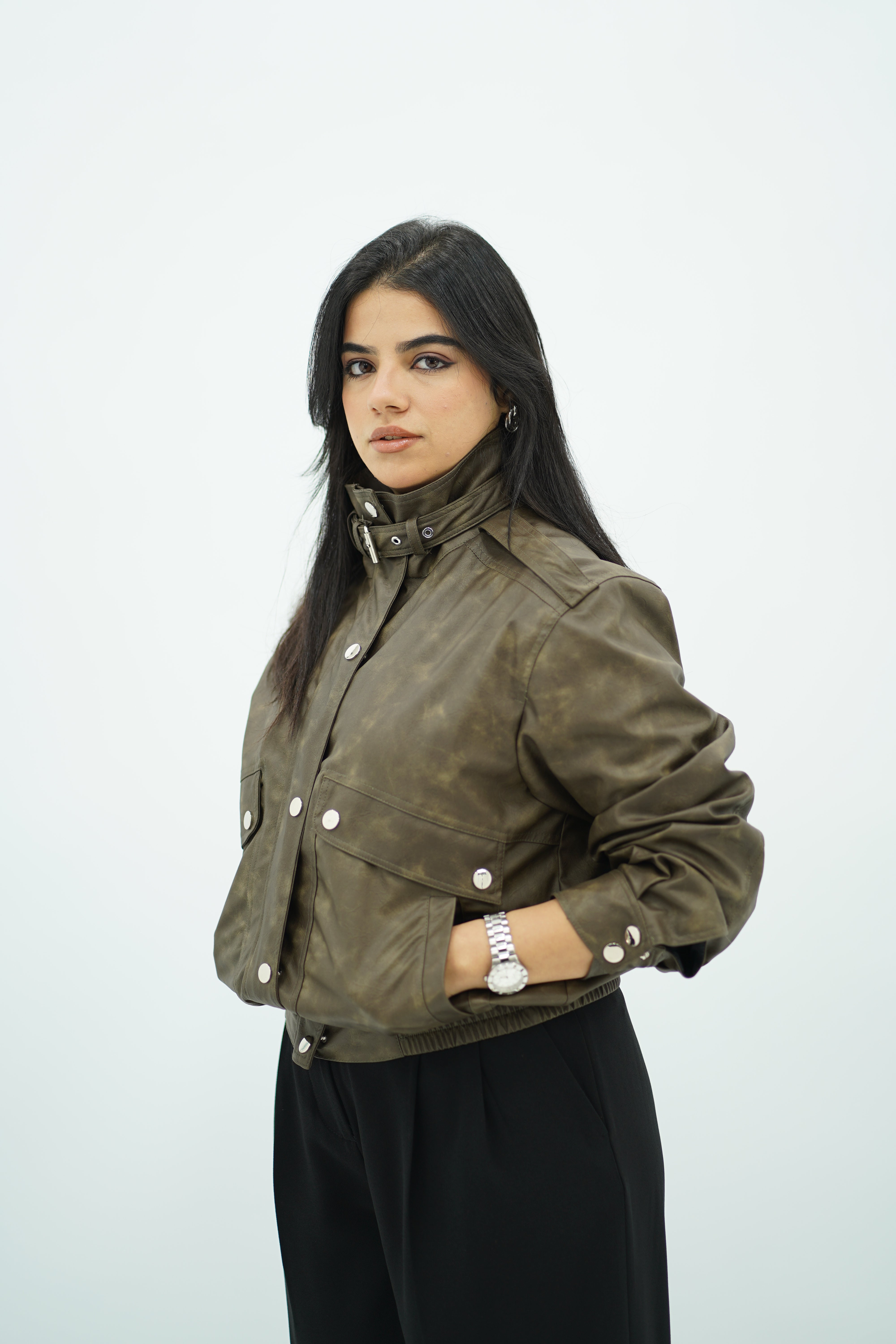 Ce blouson bomber pour femme arbore avec un effet légèrement vieilli qui lui confère une allure vintage et robuste. Confectionné en similicuir, il présente un col montant avec une bride à pression, une fermeture éclair centrale, et des poches poitrine à rabat et pression, typiques du style aviateur ou militaire. La coupe est ample et décontractée, idéale pour superposer et ajouter une touche audacieuse et tendance à une tenue chic décontractée, comme le montre l'association avec un haut et un pantalon noirs.