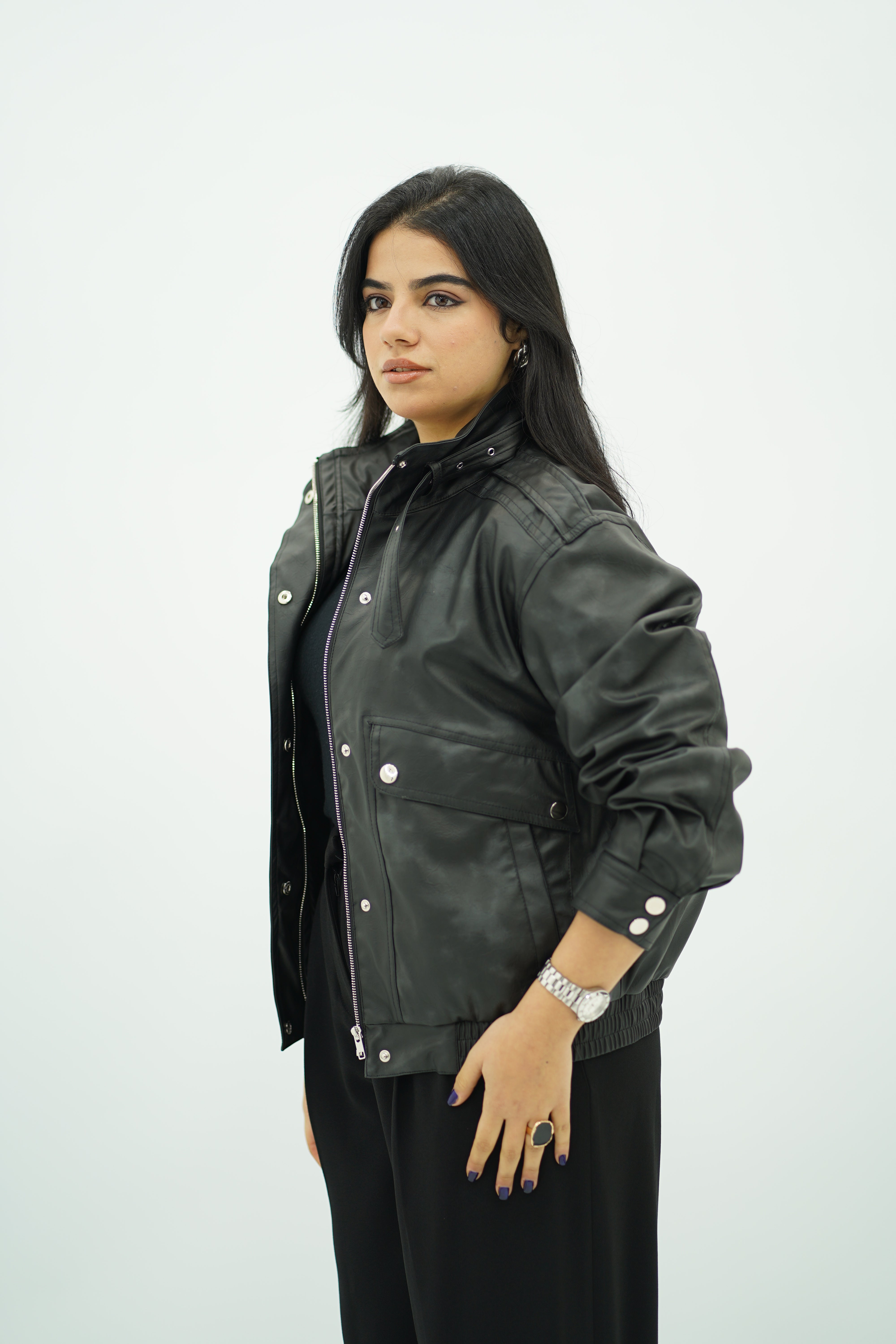 Ce blouson bomber pour femme arbore en noir avec un effet légèrement vieilli qui lui confère une allure vintage et robuste. Confectionné en similicuir, il présente un col montant avec une bride à pression, une fermeture éclair centrale, et des poches poitrine à rabat et pression, typiques du style aviateur ou militaire. La coupe est ample et décontractée, idéale pour superposer et ajouter une touche audacieuse et tendance à une tenue chic décontractée, comme le montre l'association avec un haut et un pantalon noirs.