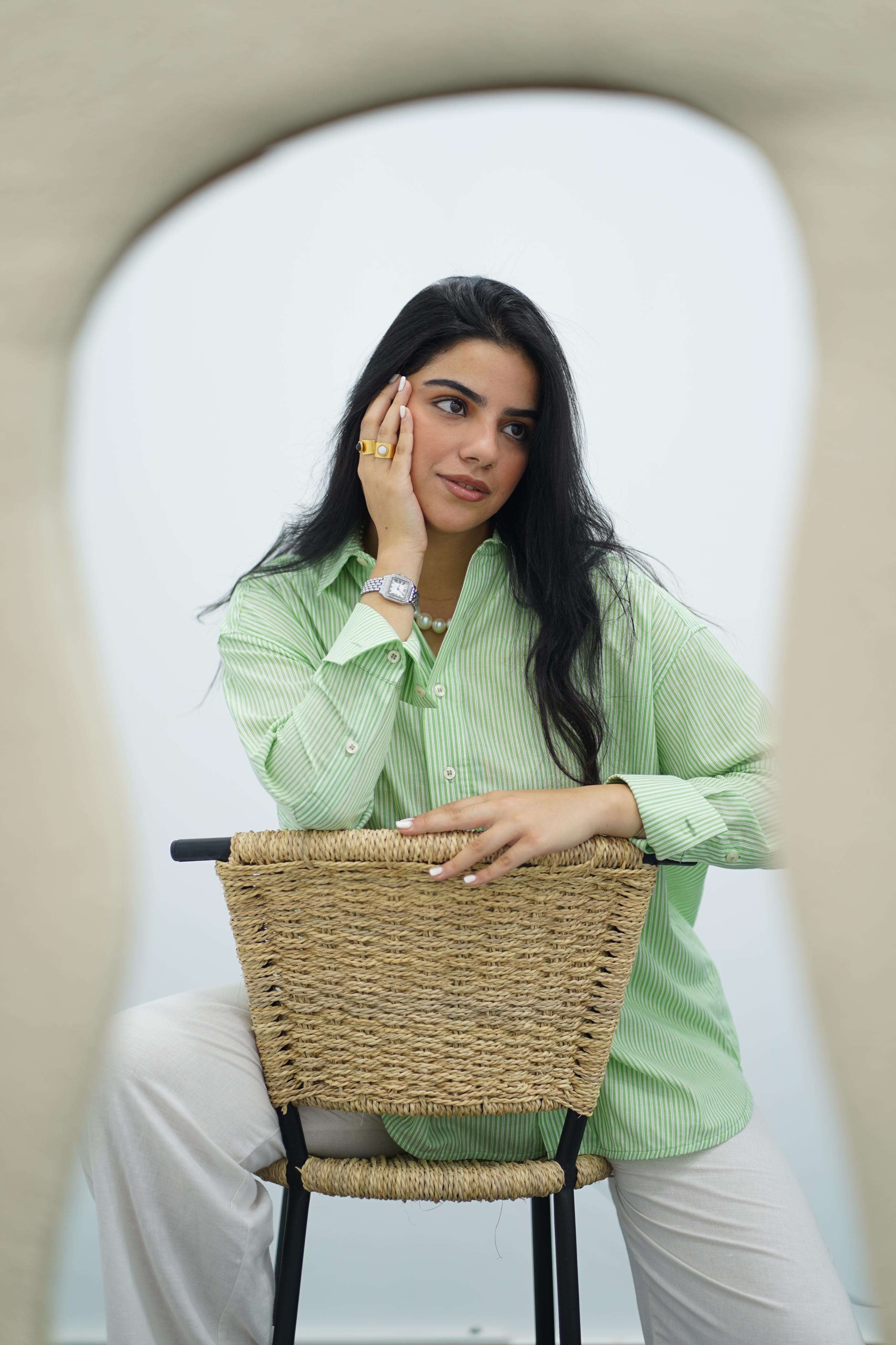 Chemise oversize en coton léger, ornée de fines rayures verticales vert menthe et blanches. Sa coupe ample et décontractée est idéale pour un look frais et moderne. Elle se distingue par son col classique et son ourlet fendu qui assure fluidité et confort.