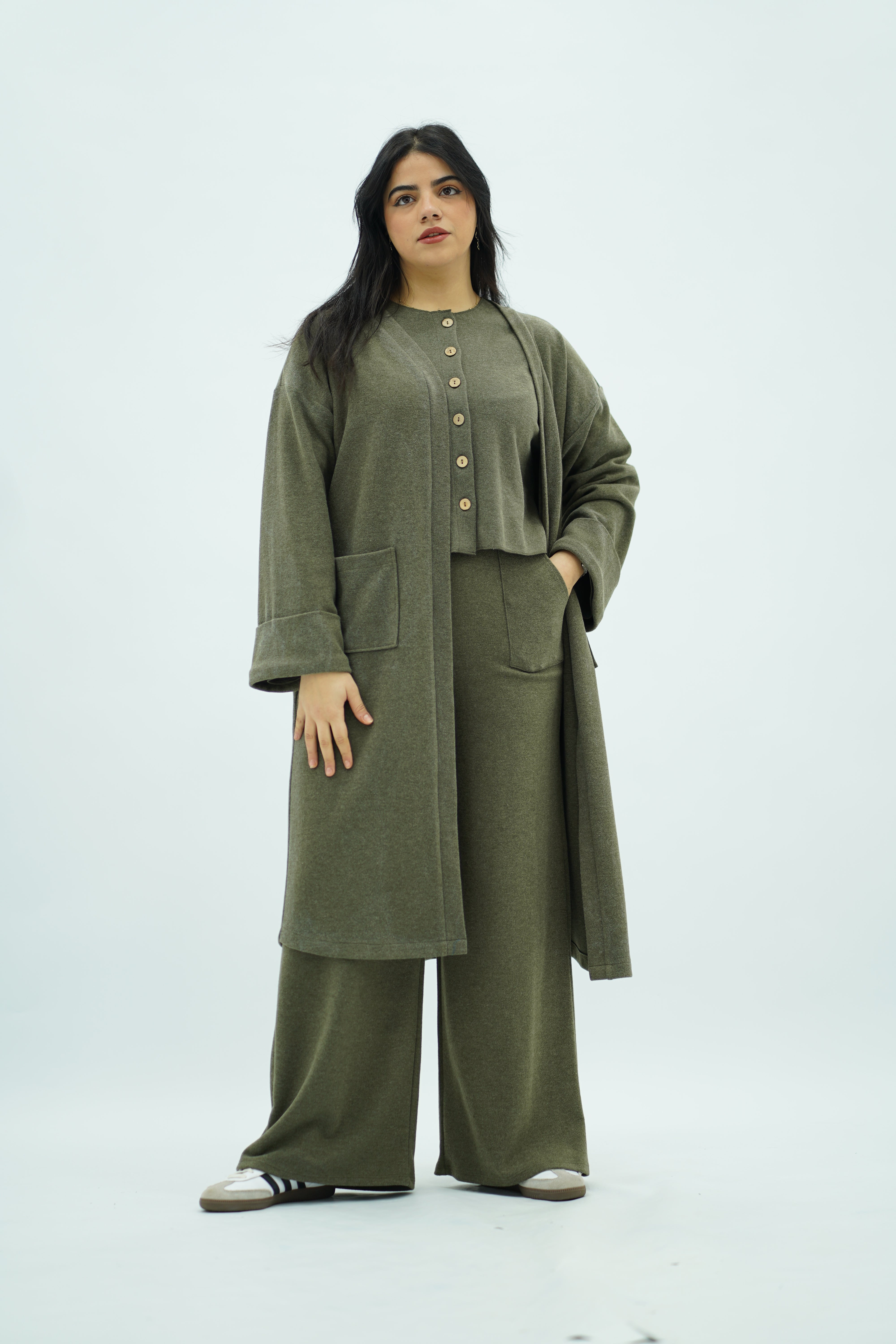 Craquez pour cet ensemble en maille trois pièces au style chic et décontracté, parfait pour un look moderne et confortable. Composé d’un haut boutonné, d’un pantalon large fluide et d’un cardigan long assorti, il offre une silhouette harmonieuse et élégante.