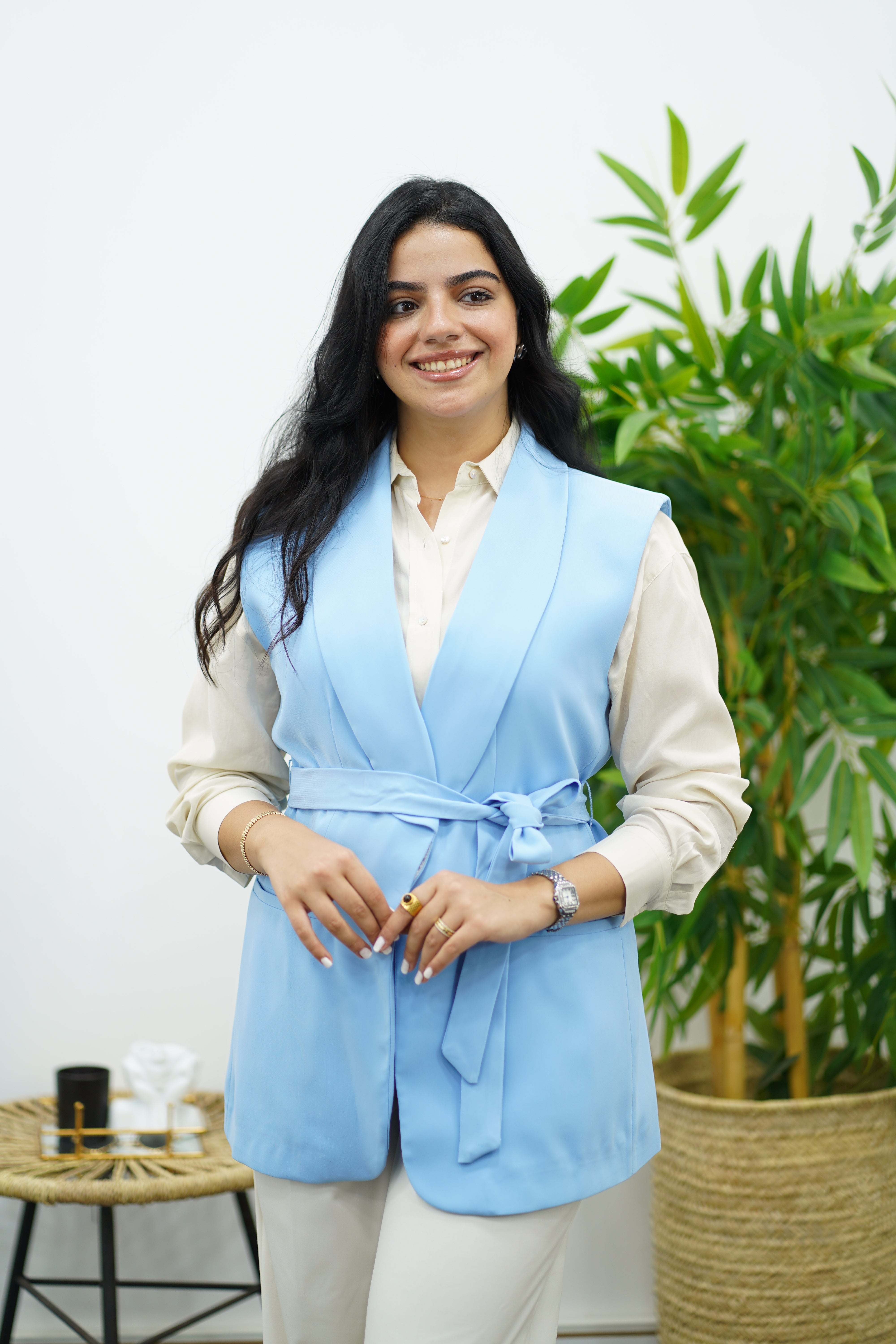 Un gilet chic et moderne, sans manches, doté d’une ceinture pour mettre en valeur la taille. Facile à associer avec une chemise ou un haut léger, il apporte élégance et sophistication à toutes vos tenues.