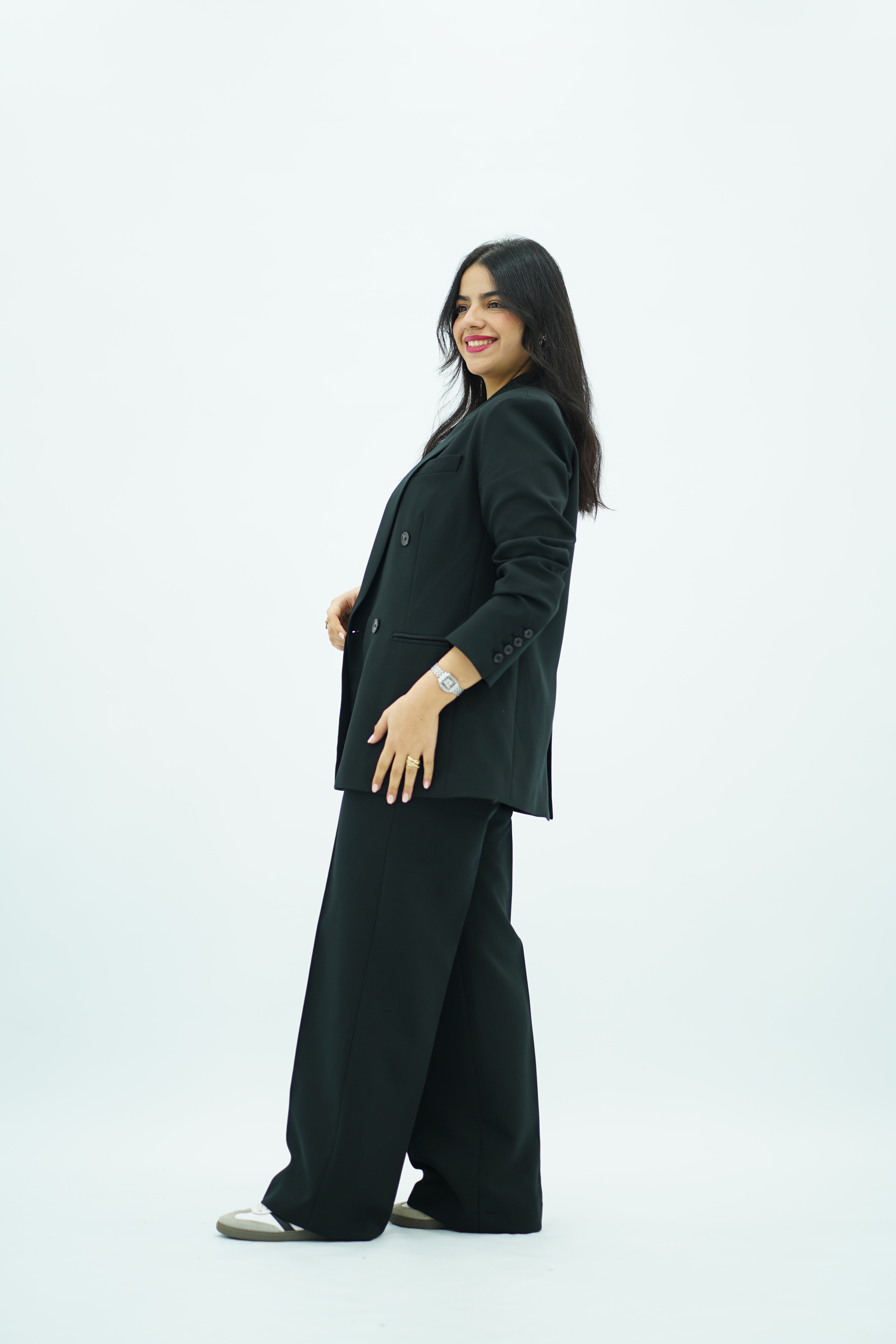 • Pantalon : Taille haute et jambe large pour une silhouette allongée.