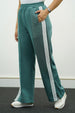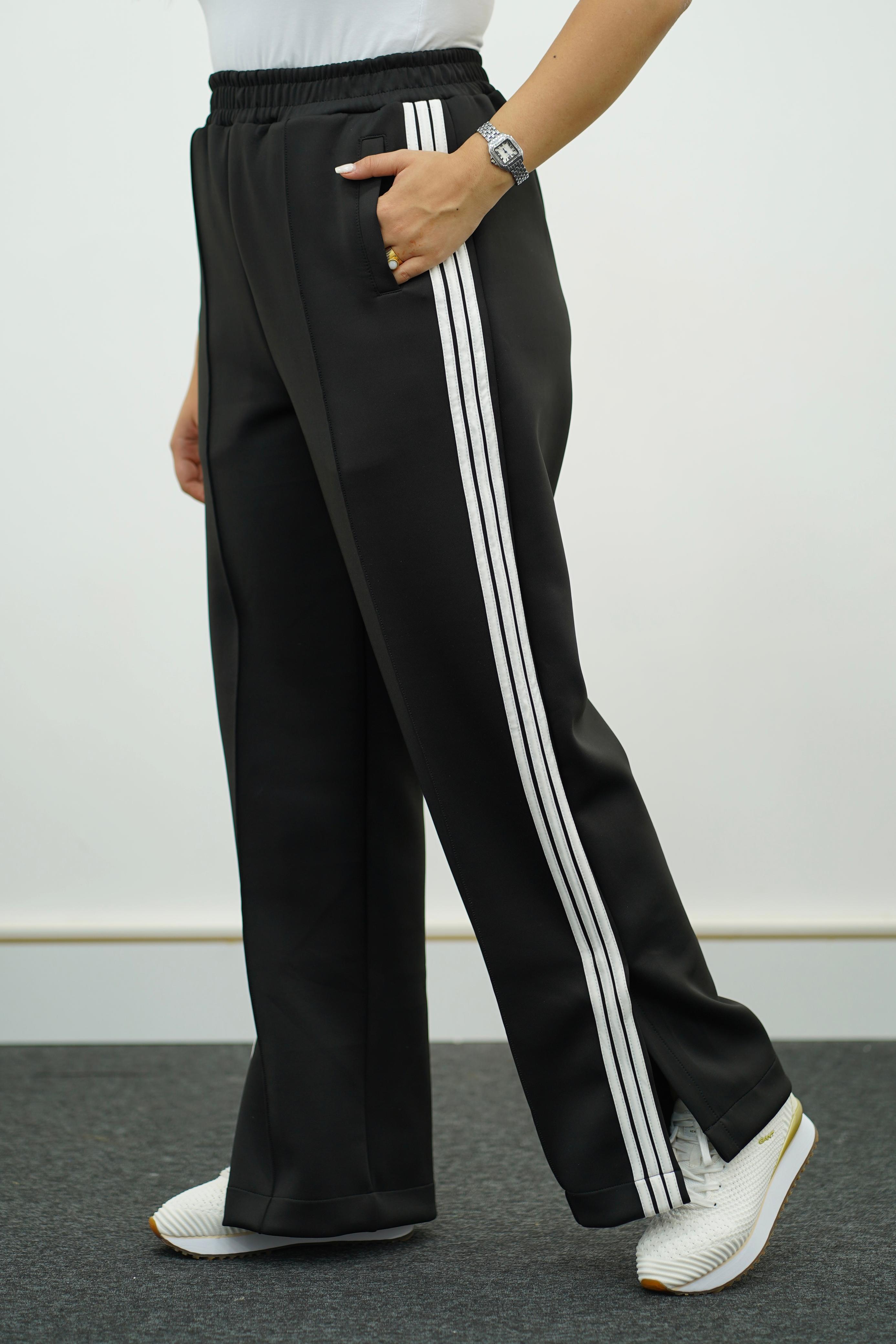 Pantalon de survêtement (ou athleisure) de couleur déférents à coupe large et fluide. Il présente une taille élastiquée et des doubles bandes blanches verticales sur les côtés.