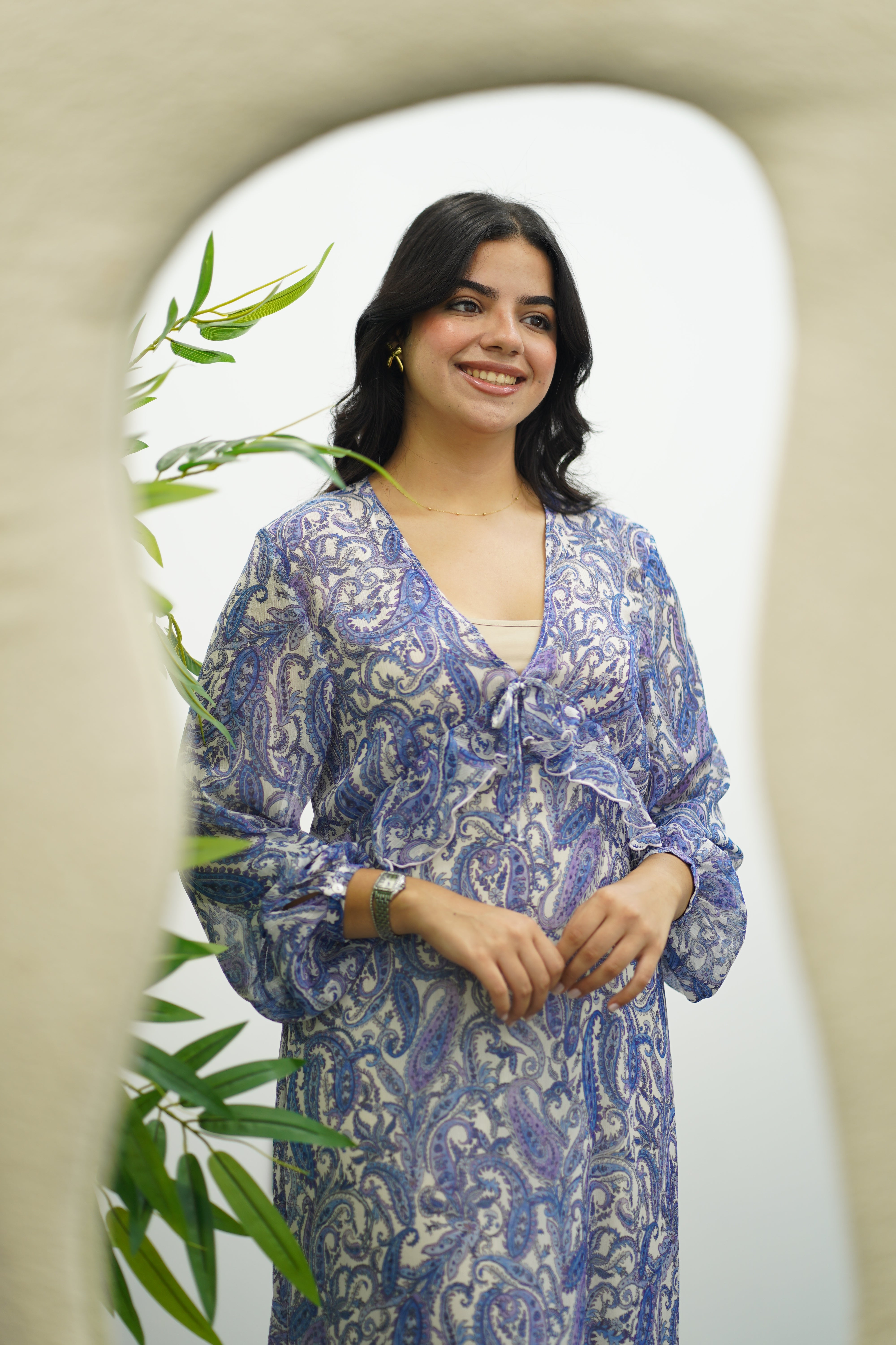 Apportez une touche de romantisme Ă votre garde-robe avec cette robe midi fluide Ă lâimprimĂ© floral dĂ©licatement vintage. ConfectionnĂ©e dans un tissu lĂ©ger et aĂ©rien, elle sĂ©duit par son jeu de transparence subtil, ses manches longues lĂ©gĂšrement bouffantes, et son dĂ©colletĂ© en V rehaussĂ© dâun nĆud raffinĂ©. La jupe Ă©vasĂ©e est soulignĂ©e dâun volant au bas, ajoutant du mouvement et de la fĂ©minitĂ© Ă chaque pas. Parfaite pour vos sorties estivales, elle se porte aussi bien avec des sandales plates quâavec des talons pour une allure plus habillĂ©e.