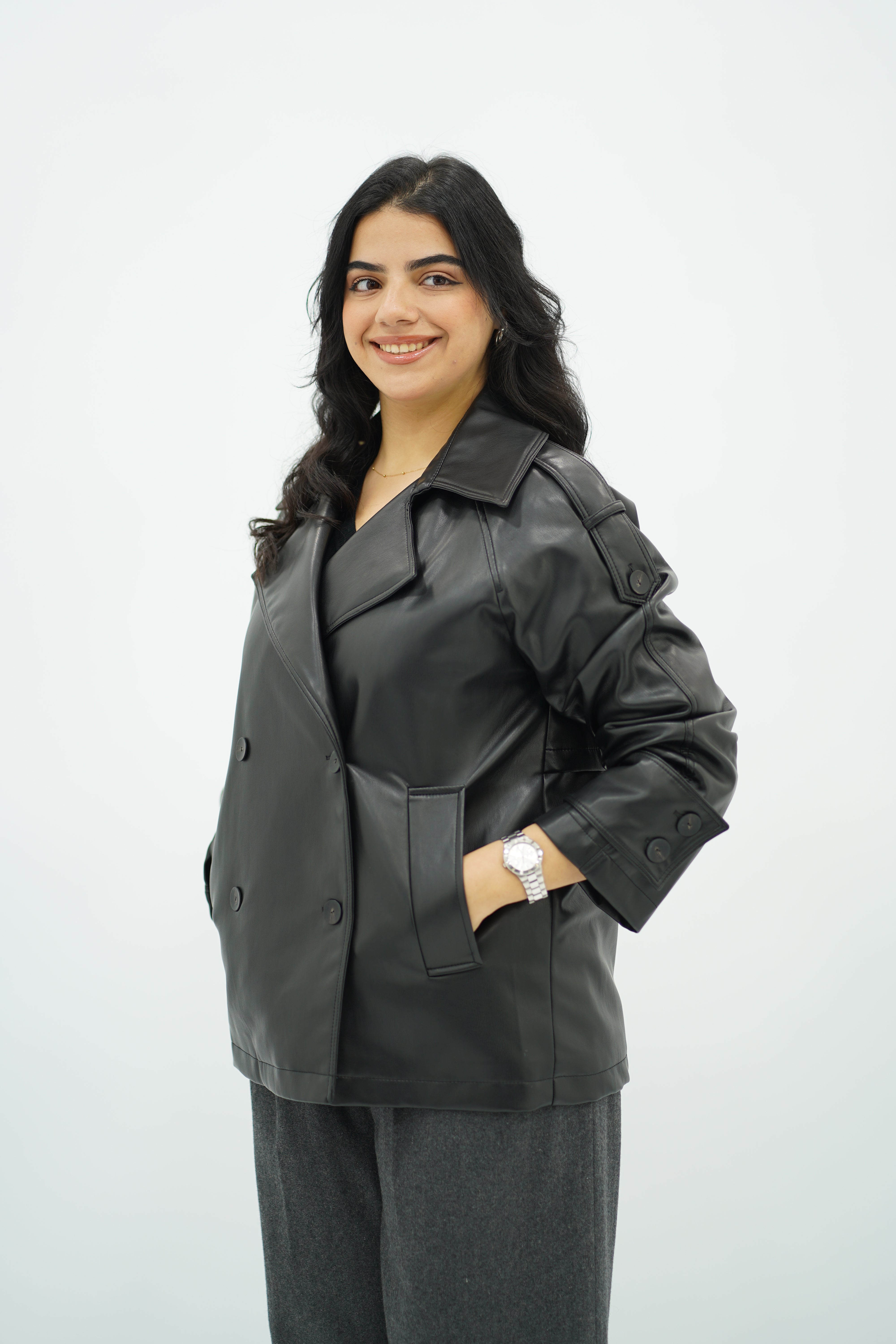 Ce trench cropped en similicuir, en noir , est la pièce parfaite pour un style audacieux. Sa coupe courte et ses détails boutonnés modernisent le classique. Il est ici associé à un pantalon large noir pour une silhouette chic et contemporaine.