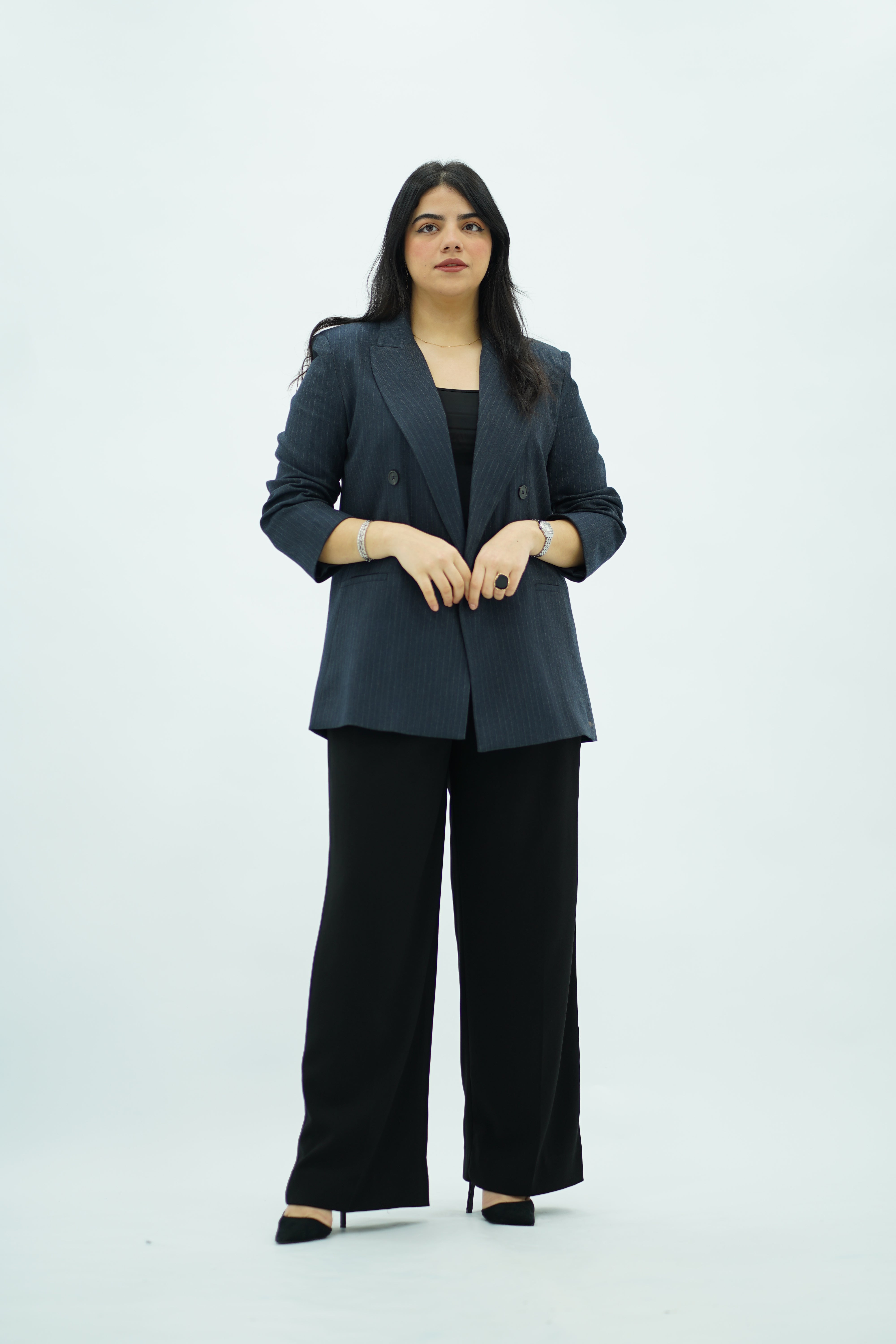 Veste blazer élégante à fines rayures, coupe droite et fermeture double boutonnage. Un modèle intemporel qui apporte une touche chic et professionnelle à toutes vos tenues, parfaite pour le bureau comme pour un look casual sophistiqué.